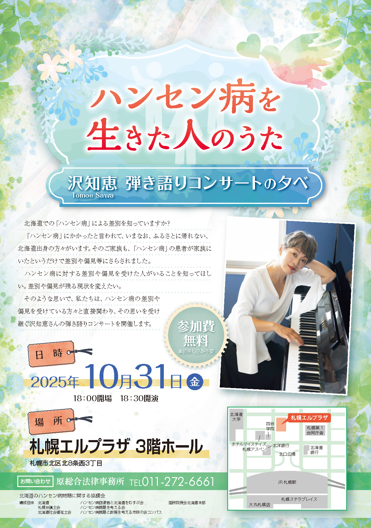 10/31(金)「ハンセン病を生きた人のうた-沢知恵弾き語りコンサートの夕べ」 のご案内(事前申込不要)