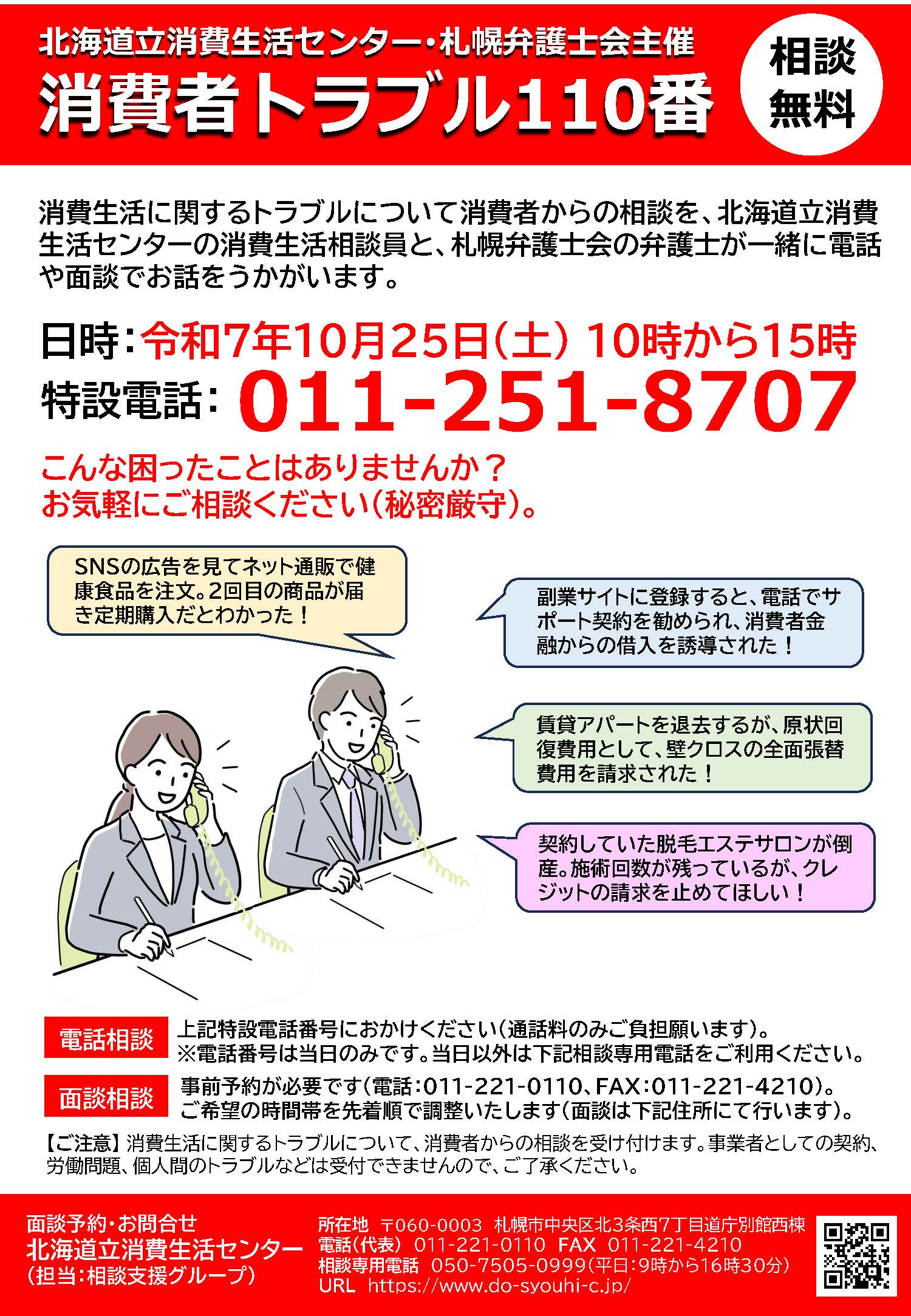 イベント概要 | 年に2回(春と秋)、札幌弁護士会と北海道立消費生活センターが共催している消費 者被害に関する110番相談です。 「消費者トラブル110番」として広く消費生活に関するトラブルの相談に対応しま す。 事前に北海道立消費生活センター宛に予約すれば、1時間程度の面談による相談(無 料)も可能です。 電話・面談ともに、北海道立消費生活センターの相談員と札幌弁護士会消費者保護委 員会の弁護士がペアで対応します。 |