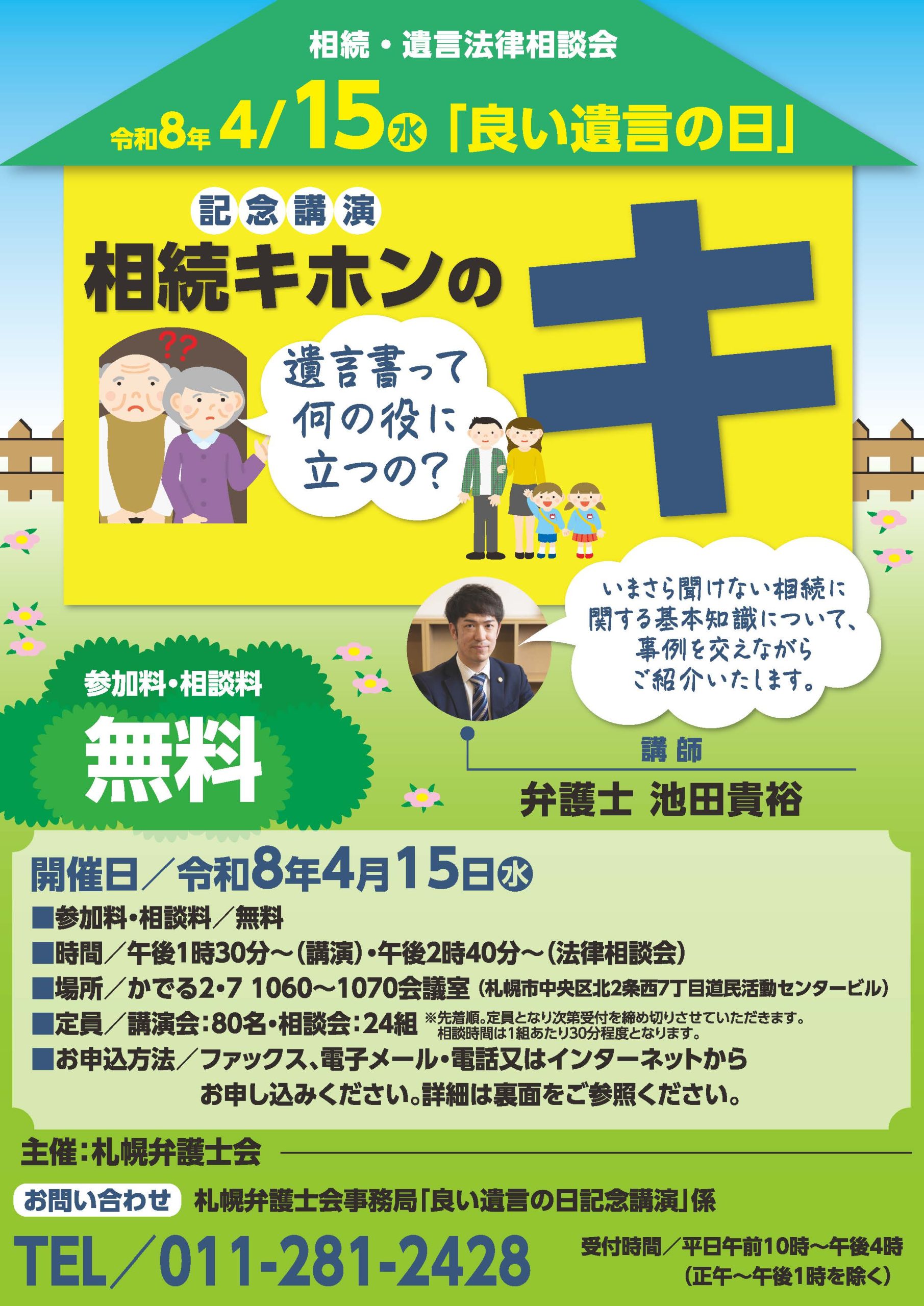 | 問い合わせ先 | 札幌弁護士会事務局「良い遺言の日記念講演」係 011-281-2428 |