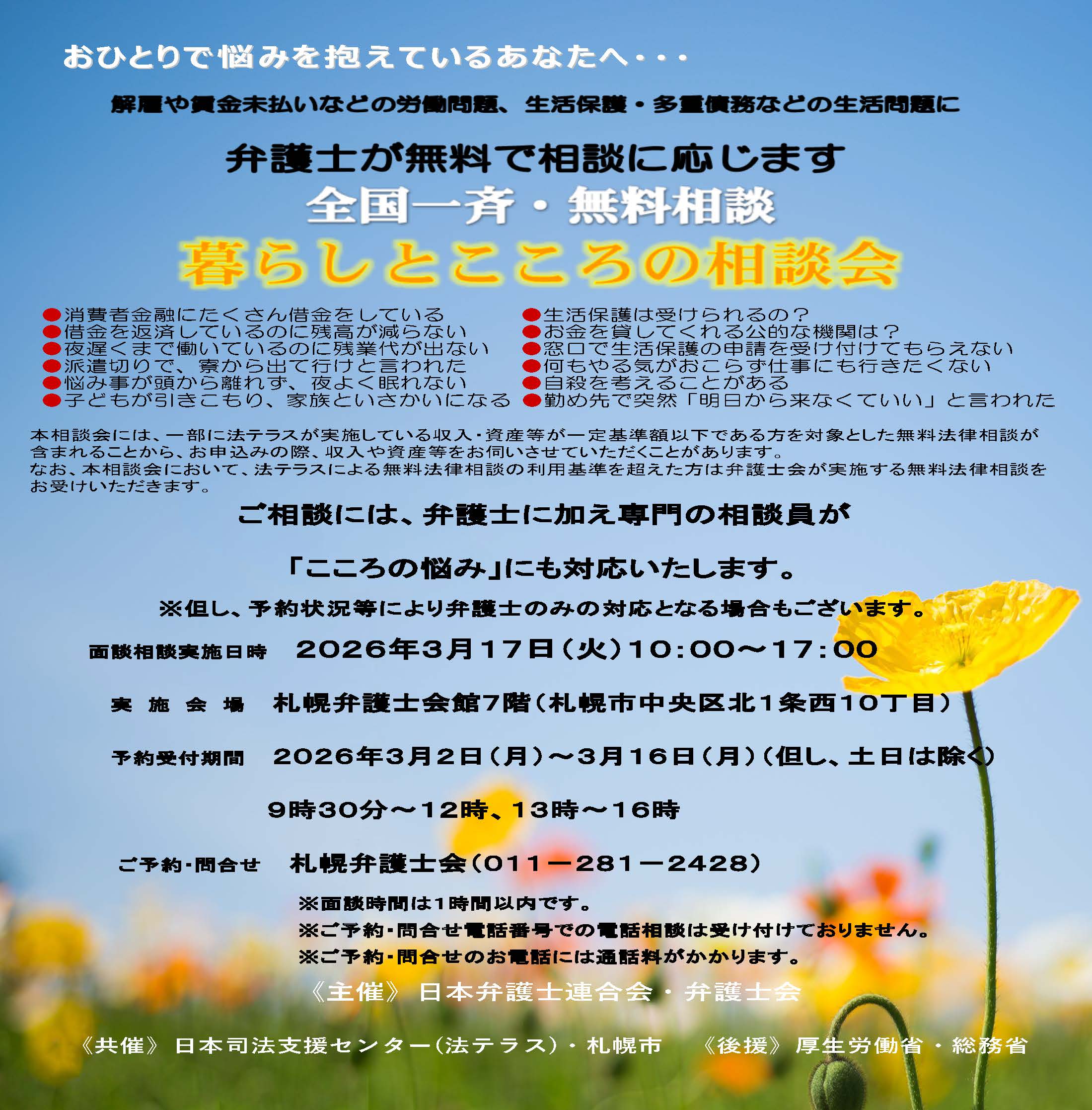 | 参加方法 | 札幌弁護士会(011-281-2428)に電話予約が必要です。予約受付期間 は、2026年3月2日(月)~3月16日(月)(但し、土日は除く)9:30~ 12:00、13:00~16:00です。 |